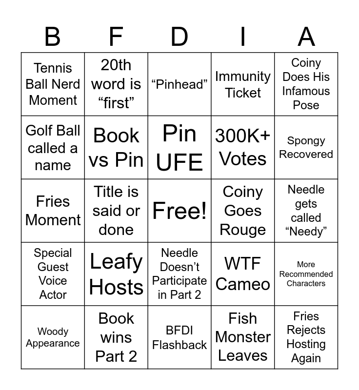 This bingo card has a free space and 24 words: Leafy Hosts, Book wins Part 2, Pin UFE, Woody Appearance, Coiny Does His Infamous Pose, Tennis Ball Nerd Moment, Golf Ball called a name, 20th word is “first”, Coiny Goes Rouge, Needle Doesn’t Participate in Part 2, 300K+ Votes, Fries Moment, WTF Cameo, More Recommended Characters, Book vs Pin, Fish Monster Leaves, Needle gets called “Needy”, “Pinhead”, Spongy Recovered, Title is said or done, Fries Rejects Hosting Again, Special Guest Voice Actor, Immunity Ticket and BFDI Flashback.