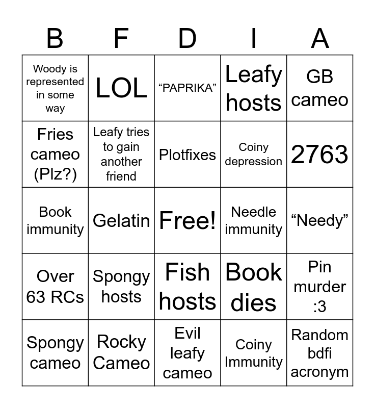 This bingo card has a free space and 24 words: Spongy hosts, Rocky Cameo, Plotfixes, Spongy cameo, GB cameo, Woody is represented in some way, Fries cameo (Plz?), LOL, Needle immunity, Fish hosts, Coiny depression, Book immunity, Book dies, Pin murder :3, Leafy tries to gain another friend, Coiny Immunity, “Needy”, “PAPRIKA”, 2763, Gelatin, Random bdfi acronym, Over 63 RCs, Leafy hosts and Evil leafy cameo.