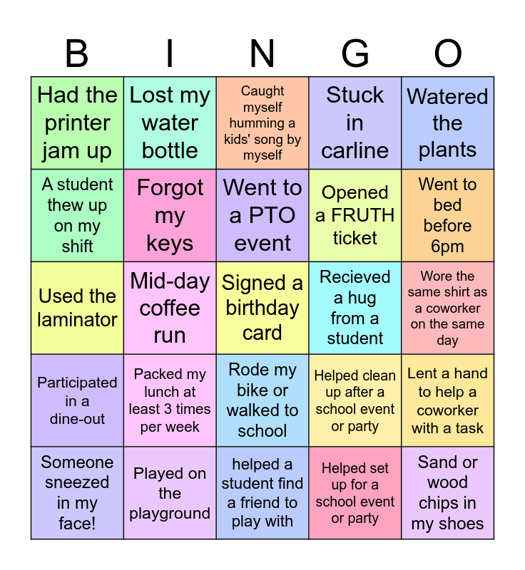 This bingo card has a free space and 24 words: Packed my lunch at least 3 times per week, Played on the playground, Went to a PTO event, Someone sneezed in my face!, Watered the plants, Had the printer jam up, A student thew up on my shift, Lost my water bottle, Recieved a hug from a student, Rode my bike or walked to school, Opened a FRUTH ticket, Used the laminator, Helped clean up after a school event or party, Lent a hand to help a coworker with a task, Forgot my keys, Helped set up for a school event or party, Wore the same shirt as a coworker on the same day, Caught myself humming a kids' song by myself, Went to bed before 6pm, Mid-day coffee run, Sand or wood chips in my shoes, Participated in a dine-out, Stuck in carline and helped a student find a friend to play with.