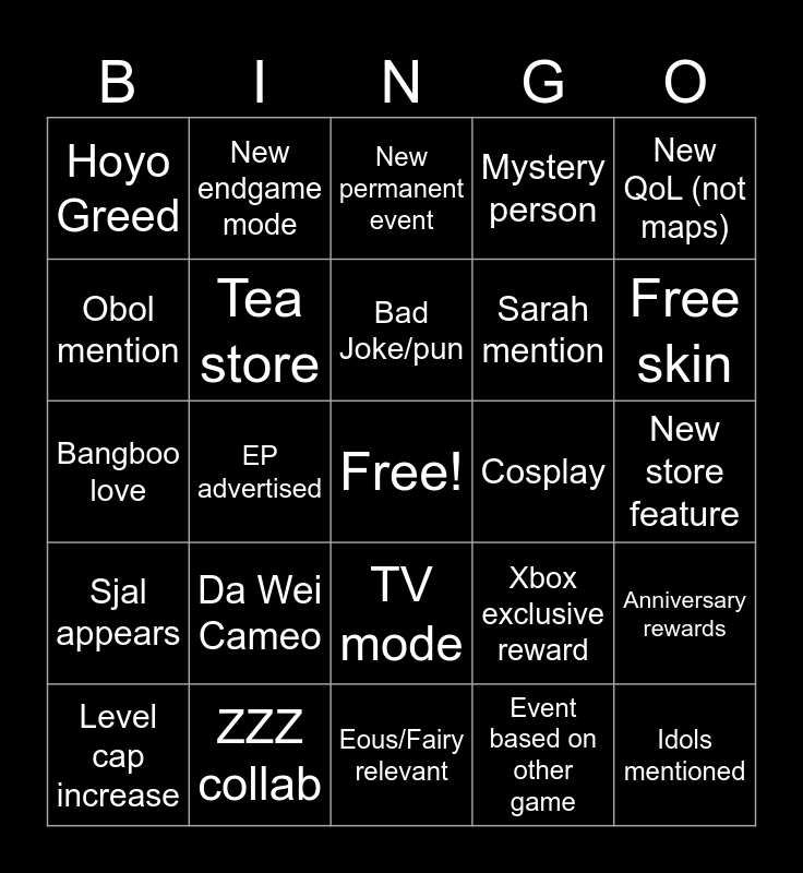 This bingo card has a free space and 24 words: Da Wei Cameo, ZZZ collab, Bad Joke/pun, Level cap increase, New QoL (not maps), Hoyo Greed, Obol mention, New endgame mode, Cosplay, TV mode, Sarah mention, Bangboo love, Xbox exclusive reward, Anniversary rewards, Tea store, Event based on other game, New store feature, New permanent event, Free skin, EP advertised, Idols mentioned, Sjal appears, Mystery person and Eous/Fairy relevant.
