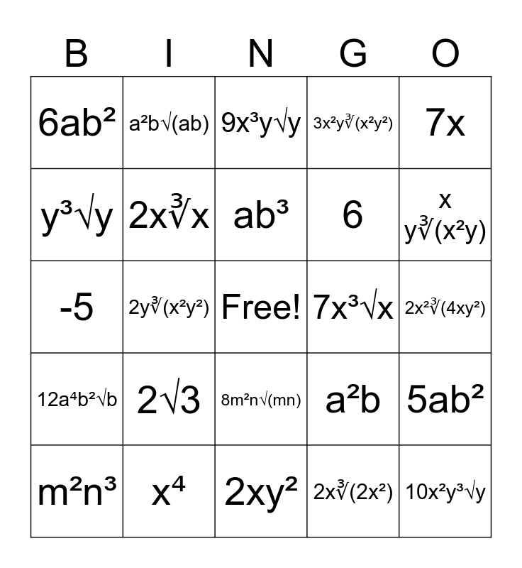 This bingo card has a free space and 24 words: 2√3, x⁴, ab³, m²n³, 7x, 6ab², y³√y, a²b√(ab), 7x³√x, 8m²n√(mn), 6, -5, a²b, 5ab², 2x∛x, 2x∛(2x²), 2x²∛(4xy²), 9x³y√y, x y∛(x²y), 2y∛(x²y²), 10x²y³√y, 12a⁴b²√b, 3x²y∛(x²y²) and 2xy².