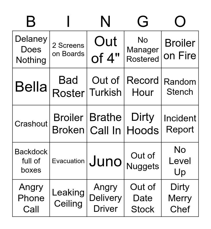 This bingo card has a free space and 55 words: Refund, Angry Phone Call, Logan Outside, Delaney Does Nothing, Angry Delivery Driver, Stock on Floor, Bad Roster, 2k Hour, Record Hour, Late SKH, No Manager Rostered, Stock in Window 1, Who?, Declan Brown, FOH Ethan, Marina Close, Broiler on Fire, Broiler Broken, Fryer Broken, Dirty Merry Chef, Dirty Hoods, Clogged Binwash, Out of Nuggets, Out of 4", Stock Run, Out of Turkish, Out of Date Stock, Crying FOH, Incident Report, No Level Up, 15+ Minute Order, Where's My BOH, Where's My FOH, Where's My Manager, Bella, Crashout, Breakfast washup at 8pm+, Backdock full of boxes, Taylor mein, Damien morran, 2 Screens on Boards, "I'm quitting", 20 Minute Bathroom Break, No 8-4, Evacuation, Leaking Ceiling, Late Manager, Late Crew, No Show, Random Stench, Opener Does Overnight, Taylor Swift, Hot To Go, Juno and Trouble Maker.