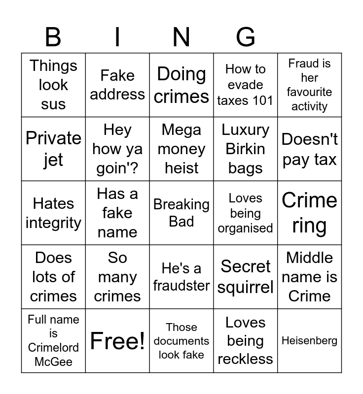 This bingo card has 30 words: Free!, Doing really bad fraud, Has a fake name, Lots of papers, Things look sus, Doing crimes, Hey how ya goin'?, He's a fraudster, Loves being organised, Those documents look fake, Crime ring, Breaking Bad, Loves being reckless, Heisenberg, Doesn't pay tax, Hates tax, Secret squirrel, Does lots of crimes, So many crimes, Fraud is her favourite activity, Hates integrity, Money laundering, Fake address, Luxury Birkin bags, Private jet, How to evade taxes 101, Middle name is Crime, Full name is Crimelord McGee, Mega money heist and Lots of crimes, so many.