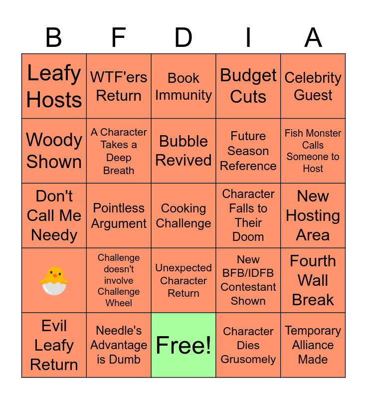 This bingo card has 25 words: 🐣, Needle's Advantage is Dumb, Cooking Challenge, Character Dies Grusomely, Celebrity Guest, Leafy Hosts, WTF'ers Return, Book Immunity, Character Falls to Their Doom, Fourth Wall Break, Woody Shown, A Character Takes a Deep Breath, Free!, New BFB/IDFB Contestant Shown, Fish Monster Calls Someone to Host, Evil Leafy Return, Pointless Argument, Bubble Revived, Future Season Reference, New Hosting Area, Don't Call Me Needy, Challenge doesn't involve Challenge Wheel, Unexpected Character Return, Budget Cuts and Temporary Alliance Made.