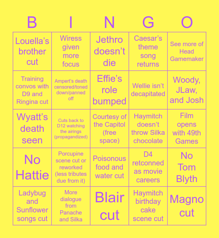 This bingo card has a free space and 24 words: Ladybug and Sunflower songs cut, Porcupine scene cut or reworked (less tributes due from it), Effie’s role bumped, Haymitch birthday cake scene cut, See more of Head Gamemaker, Louella’s brother cut, Wiress given more focus, Jethro doesn’t die, Haymitch doesn’t throw Silka chocolate, Film opens with 49th Games, Wyatt’s death seen, Ampert’s death censored/toned down/panned off, D4 retconned as movie careers, No Tom Blyth, Training convos with D9 and Ringina cut, More dialogue from Panache and Silka, Blair cut, Caesar’s theme song returns, Woody, JLaw, and Josh, No Hattie, Cuts back to D12 watching the airings (propagandized), Poisonous food and water cut, Wellie isn’t decapitated and Magno cut.