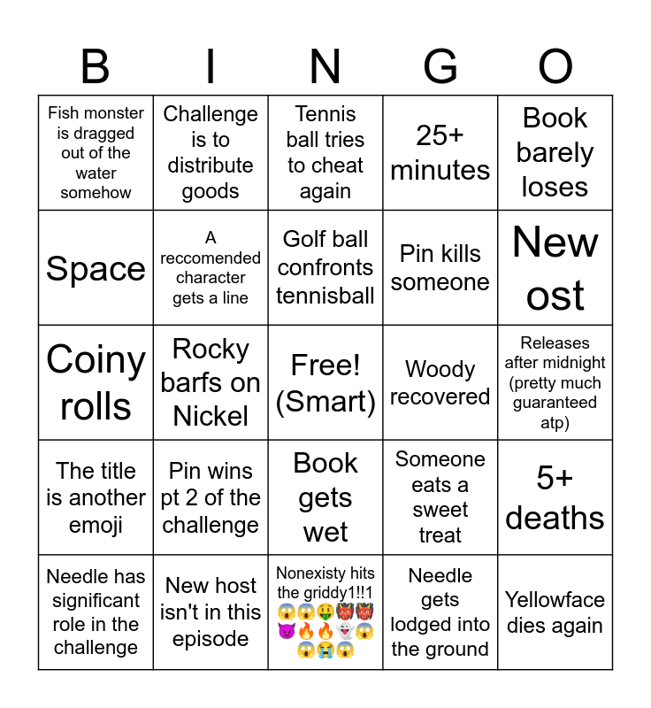 This bingo card has a free space and 24 words: Pin wins pt 2 of the challenge, New host isn't in this episode, Golf ball confronts tennisball, Needle has significant role in the challenge, Book barely loses, Fish monster is dragged out of the water somehow, Space, Challenge is to distribute goods, Woody recovered, Book gets wet, Pin kills someone, Coiny rolls, Someone eats a sweet treat, 5+ deaths, A reccomended character gets a line, Needle gets lodged into the ground, Releases after midnight (pretty much guaranteed atp), Tennis ball tries to cheat again, New ost, Rocky barfs on Nickel, Yellowface dies again, The title is another emoji, 25+ minutes and Nonexisty hits the griddy1!!1π±π±π€πΉπΉππ₯π₯π»π±π±ππ±.