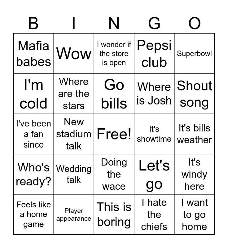 This bingo card has a free space and 24 words: Wedding talk, Player appearance, Go bills, Feels like a home game, Superbowl, Mafia babes, I'm cold, Wow, It's showtime, Doing the wace, Where is Josh, I've been a fan since, Let's go, It's windy here, Where are the stars, I hate the chiefs, It's bills weather, I wonder if the store is open, Shout song, New stadium talk, I want to go home, Who's ready?, Pepsi club and This is boring.
