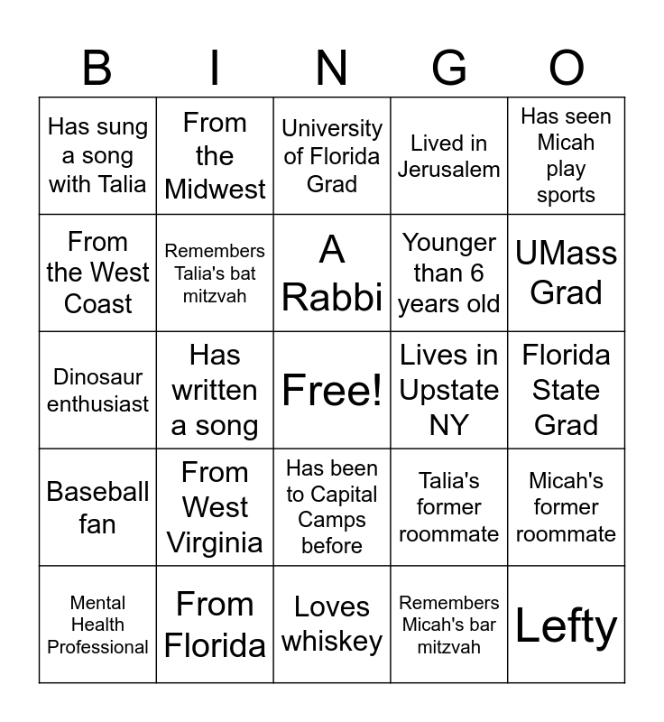 This bingo card has a free space and 24 words: From West Virginia, From Florida, A Rabbi, Mental Health Professional, Has seen Micah play sports, Has sung a song with Talia, From the West Coast, From the Midwest, Lives in Upstate NY, Has been to Capital Camps before, Younger than 6 years old, Dinosaur enthusiast, Talia's former roommate, Micah's former roommate, Remembers Talia's bat mitzvah, Remembers Micah's bar mitzvah, Florida State Grad, University of Florida Grad, UMass Grad, Has written a song, Lefty, Baseball fan, Lived in Jerusalem and Loves whiskey.