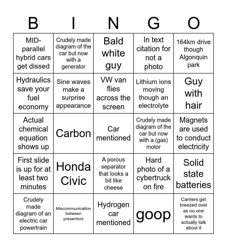 This bingo card has a free space and 25 words: Honda Civic, Hydrogen car mentioned, VW van flies across the screen, Crudely made diagram of an electric car powertrain, 164km drive though Algonquin park, MID-parallel hybrid cars get dissed, Hydraulics save your fuel economy, Crudely made diagram of the car but now with a generator, Crudely made diagram of the car but now with a (gas) motor, A porous separator that looks a bit like cheese, Lithium ions moving though an electrolyte, Actual chemical equation shows up, Hard photo of a cybertruck on fire, Solid state batteries, Sine waves make a surprise appearance, Animated diagram, Magnets are used to conduct electricity, Bald white guy, Guy with hair, Carbon, Carriers get breezed over as no one wants to actually talk about it, Miscommunication between presentors, First slide is up for at least two minutes, In text citation for not a photo and goop.