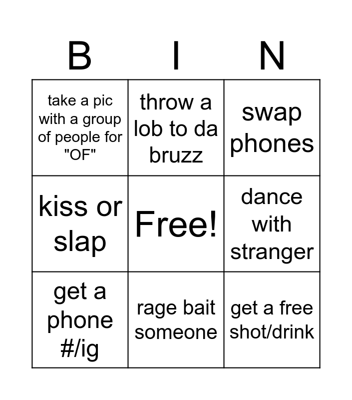 This bingo card has a free space and 8 words: dance with stranger, swap phones, throw a lob to da bruzz, get a phone #/ig, take a pic with a group of people for "OF", get a free shot/drink, kiss or slap and rage bait someone.