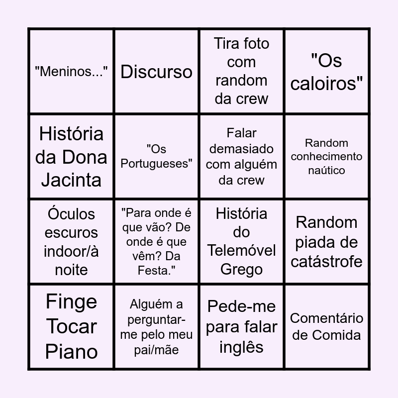 This bingo card has 16 words: Alguém a perguntar-me pelo meu pai/mãe, Random piada de catástrofe, Tira foto com random da crew, "Meninos...", Óculos escuros indoor/à noite, Discurso, História do Telemóvel Grego, Pede-me para falar inglês, História da Dona Jacinta, "Os Portugueses", Finge Tocar Piano, "Os caloiros", "Para onde é que vão? De onde é que vêm? Da Festa.", Random conhecimento naútico, Falar demasiado com alguém da crew and Comentário de Comida.