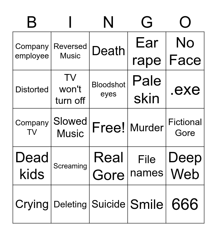 This bingo card has a free space and 24 words: Crying, Screaming, Bloodshot eyes, Smile, No Face, Company employee, Reversed Music, Death, Murder, Fictional Gore, Company TV, TV won't turn off, File names, Deep Web, Distorted, Deleting, Suicide, Ear rape, .exe, Dead kids, Slowed Music, Real Gore, Pale skin and 666.