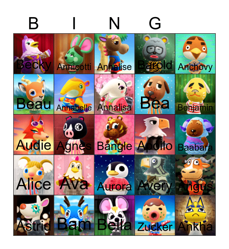 This bingo card has 31 images and 32 words: Zucker, Agent S, Agnes, Alfonso, Alice, Annabelle, Anchovy, Angus, Annicotti, Ankha, Annalisa, Annalise, Free!, Antonio, Apollo, Apple, Astrid, Audie, Aurora, Ava, Avery, Axel, Baabara, Bam, Bangle, Barold, Bea, Beau, Becky, Bella, Benedict and Benjamin.