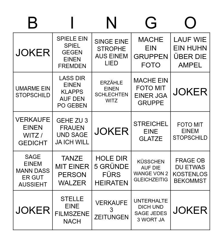 This bingo card has a free space and 24 words: TANZE MIT EINER PERSON WALZER, STELLE EINE FILMSZENE NACH, ERZÄHLE EINEN SCHLECHTEN WITZ, JOKER, LAUF WIE EIN HUHN ÜBER DIE AMPEL, JOKER, UMARME EIN STOPSCHILD, SPIELE EIN SPIEL GEGEN EINEN FREMDEN, STREICHEL EINE GLATZE, HOLE DIR 5 GRÜNDE FÜRS HEIRATEN, MACHE EIN FOTO MIT EINER JGA GRUPPE, VERKAUFE EINEN WITZ / GEDICHT, KÜSSCHEN AUF DIE WANGE VON 2 GLEICHZEITIG, FRAGE OB DU ETWAS KOSTENLOS BEKOMMST, LASS DIR EINEN KLAPPS AUF DEN PO GEBEN, UNTERHALTE DICH UND SAGE JEDES 3 WORT JA, FOTO MIT EINEM STOPSCHILD, SINGE EINE STROPHE AUS EINEM LIED, JOKER, GEHE ZU 3 FRAUEN UND SAGE JA ICH WILL, JOKER, SAGE EINEM MANN DASS ER GUT AUSSIEHT, MACHE EIN GRUPPEN FOTO and VERKAUFE 3 ZEITUNGEN.