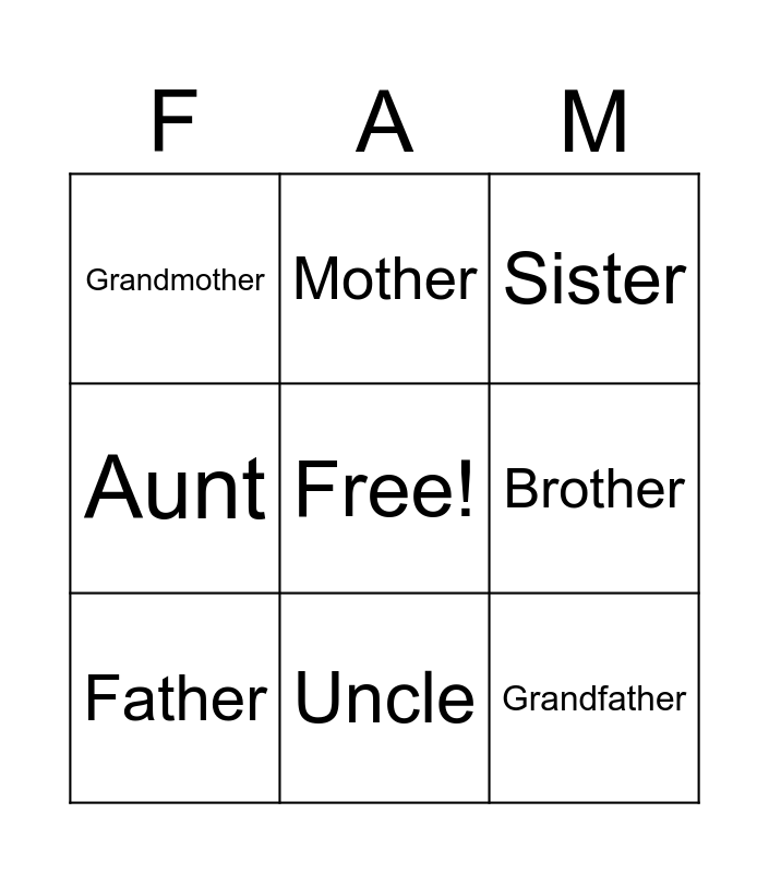 This bingo card has a free space and 8 words: Brother, Sister, Mother, Father, Grandmother, Grandfather, Aunt and Uncle.