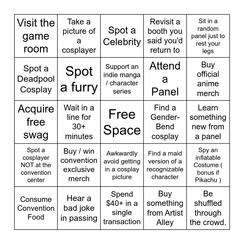 This bingo card has a free space and 28 words: Spy an inflatable Costume ( bonus if Pikachu ), Find a Demon Slayer Group Cosplay, Attend a Panel, Buy something from Artist Alley, Spot a Deadpool Cosplay, Spot a Celebrity, Take a picture of a cosplayer, Spot a cosplayer NOT at the convention center, Find a Gender-Bend cosplay, Consume Convention Food, Acquire free swag, Revisit a booth you said you'd return to, Hear a bad joke in passing, Spend $40+ in a single transaction, Buy official anime merch, Make an Impulse Purchase, Buy / win convention exclusive merch, Spot a furry, Support an indie manga / character series, Awkwardly avoid getting in a cosplay picture, Visit the game room, Someone cosplayed your favorite character!, Be shuffled through the crowd., Wait in a line for 30+ minutes, Learn something new from a panel, Find a maid version of a recognizable character, Sit in a random panel just to rest your legs and Accidentally mistake someone's cosplay for a different character.