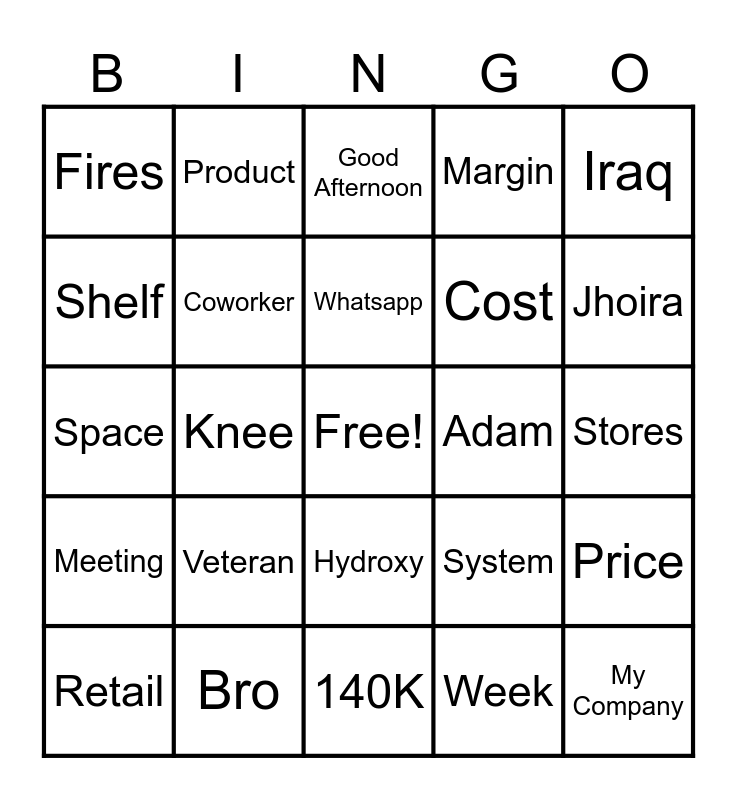 This bingo card has a free space and 24 words: Veteran, Bro, Whatsapp, Retail, Iraq, Fires, Shelf, Product, Adam, Hydroxy, Cost, Space, System, Price, Coworker, Week, Stores, Good Afternoon, Jhoira, Knee, My Company, Meeting, Margin and 140K.