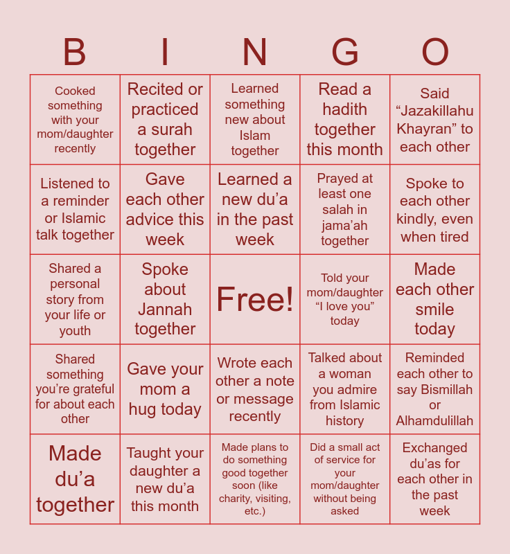 This bingo card has a free space and 24 words: Gave your mom a hug today, Taught your daughter a new du’a this month, Learned a new du’a in the past week, Made du’a together, Said “Jazakillahu Khayran” to each other, Cooked something with your mom/daughter recently, Listened to a reminder or Islamic talk together, Recited or practiced a surah together, Told your mom/daughter “I love you” today, Wrote each other a note or message recently, Prayed at least one salah in jama’ah together, Shared a personal story from your life or youth, Talked about a woman you admire from Islamic history, Reminded each other to say Bismillah or Alhamdulillah, Gave each other advice this week, Did a small act of service for your mom/daughter without being asked, Made each other smile today, Learned something new about Islam together, Spoke to each other kindly, even when tired, Spoke about Jannah together, Exchanged du’as for each other in the past week, Shared something you’re grateful for about each other, Read a hadith together this month and Made plans to do something good together soon (like charity, visiting, etc.).