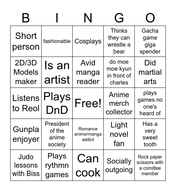 This bingo card has a free space and 24 words: President of the anime society, Plays rythmn games, Avid manga reader, Judo lessons with Biss, Gacha game giga spender, Short person, 2D/3D Models maker, fashionable, Anime merch collector, Romance anime/manga addict, do moe moe kyun in front of charles, Listens to Reol, Light novel fan, Has a very sweet tooth, Is an artist, Socially outgoing, plays games no one's heard of, Cosplays, Did martial arts, Plays DnD, Rock paper scissors with a comittee member, Gunpla enjoyer, Thinks they can wrestle a bear and Can cook.