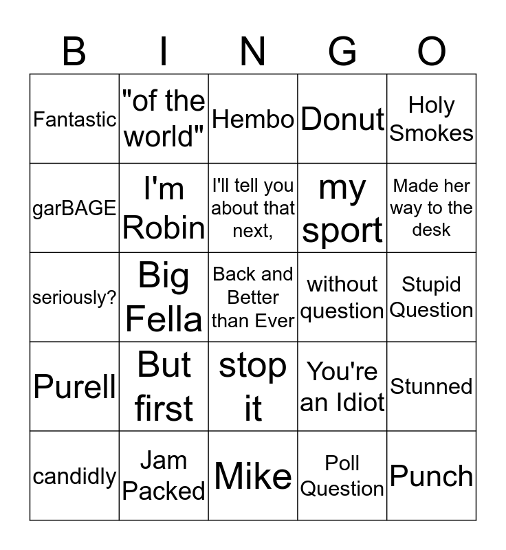 This bingo card has a free space and 24 words: But first, Jam Packed, I'll tell you about that next,, candidly, Holy Smokes, Fantastic, garBAGE, "of the world", without question, stop it, my sport, seriously?, You're an Idiot, Stunned, I'm Robin, Poll Question, Stupid Question, Hembo, Made her way to the desk, Big Fella, Punch, Purell, Donut and Mike.