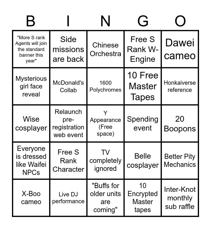 This bingo card has a free space and 24 words: Free S Rank Character, Live DJ performance, 1600 Polychromes, X-Boo cameo, Dawei cameo, "More S rank Agents will join the standard banner this year", Mysterious girl face reveal, Side missions are back, Spending event, TV completely ignored, 10 Free Master Tapes, Wise cosplayer, Belle cosplayer, Better Pity Mechanics, McDonald's Collab, 10 Encrypted Master tapes, 20 Boopons, Chinese Orchestra, Honkaiverse reference, Relaunch pre-registration web event, Inter-Knot monthly sub raffle, Everyone is dressed like Waifei NPCs, Free S Rank W-Engine and "Buffs for older units are coming".