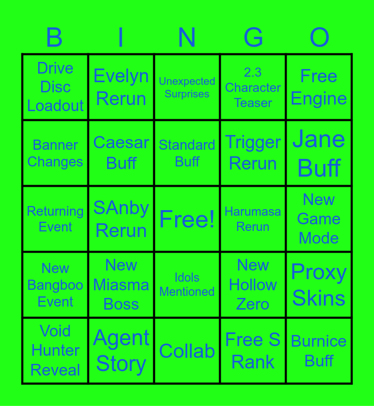 This bingo card has a free space and 24 words: Void Hunter Reveal, New Miasma Boss, Standard Buff, Free S Rank, Free Engine, Drive Disc Loadout, Evelyn Rerun, Unexpected Surprises, Harumasa Rerun, New Game Mode, Returning Event, Caesar Buff, New Hollow Zero, Proxy Skins, Banner Changes, Agent Story, Collab, 2.3 Character Teaser, Jane Buff, New Bangboo Event, SAnby Rerun, Idols Mentioned, Trigger Rerun and Burnice Buff.