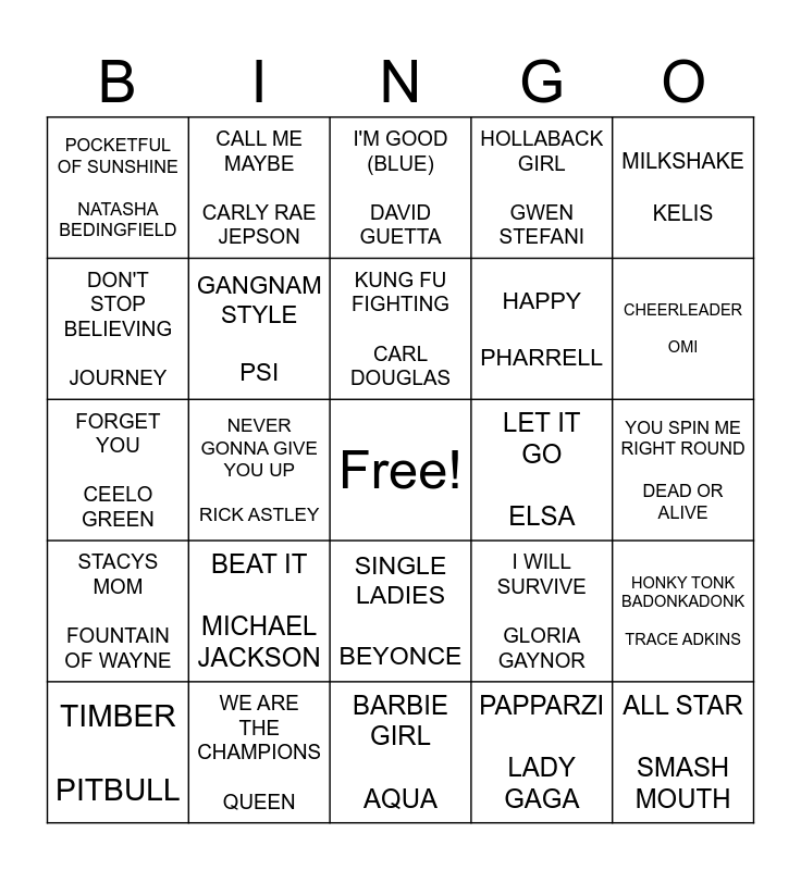 This bingo card has a free space and 49 words: I'M GONNA BE PROCLAIMERS, ALL STAR SMASH MOUTH, ANOTHER ONE BITES THE DUST QUEEN, BARBIE GIRL AQUA, BEAT IT MICHAEL JACKSON, BOHEMIAN RHAPSODY QUEEN, CALL ME MAYBE CARLY RAE JEPSON, COTTON EYE JOE REDNEX, DON'T STOP BELIEVING JOURNEY, FRESH PRINCE OF BEL AIR WILL SMITH, GANGNAM STYLE PSI, HOLLABACK GIRL GWEN STEFANI, HONKY TONK BADONKADONK TRACE ADKINS, I WILL SURVIVE GLORIA GAYNOR, BLUE EIFFEL 65, I'M TOO SEXY RIGHT SIDE FRED, KUNG FU FIGHTING CARL DOUGLAS, LET IT GO ELSA, MACERENA LOS DEL RIO, MILKSHAKE KELIS, NEVER GONNA GIVE YOU UP RICK ASTLEY, PAPPARZI LADY GAGA, POCKETFUL OF SUNSHINE NATASHA BEDINGFIELD, HAPPY PHARRELL, GOOD FEELING FLO RIDA, CHEERLEADER OMI, TIMBER PITBULL, RUDE MAGIC, SINGLE LADIES BEYONCE, STACYS MOM FOUNTAIN OF WAYNE, FINAL COUNTDOWN EUROPE, WHAT DOES THE FOX SAY YLVIS, THRILLER MICHAEL JACKSON, U CAN'T TOUCH THIS MC HAMMER, WE ARE THE CHAMPIONS QUEEN, WE LIKE TO PARTY VENGABOYS, WHAT IS LOVE HADDAWAY, WHO LET THE DOGS OUT? BAHAMEN, YOU SPIN ME RIGHT ROUND DEAD OR ALIVE, LIL BOO THANG PAUL RUSSELL, KARMA CHAMELEON CULTURE CLUB, I DON'T WANNA WAIT DAVID GUETTA, POMPEII BASTILLE, THE GIT UP BLANCO BROWN, FORGET YOU CEELO GREEN, I'M GOOD (BLUE) DAVID GUETTA, CENTERFOLD J GELLIS BAND, AFRICA TOTO and STARSHIPS NICKI MINAJ.