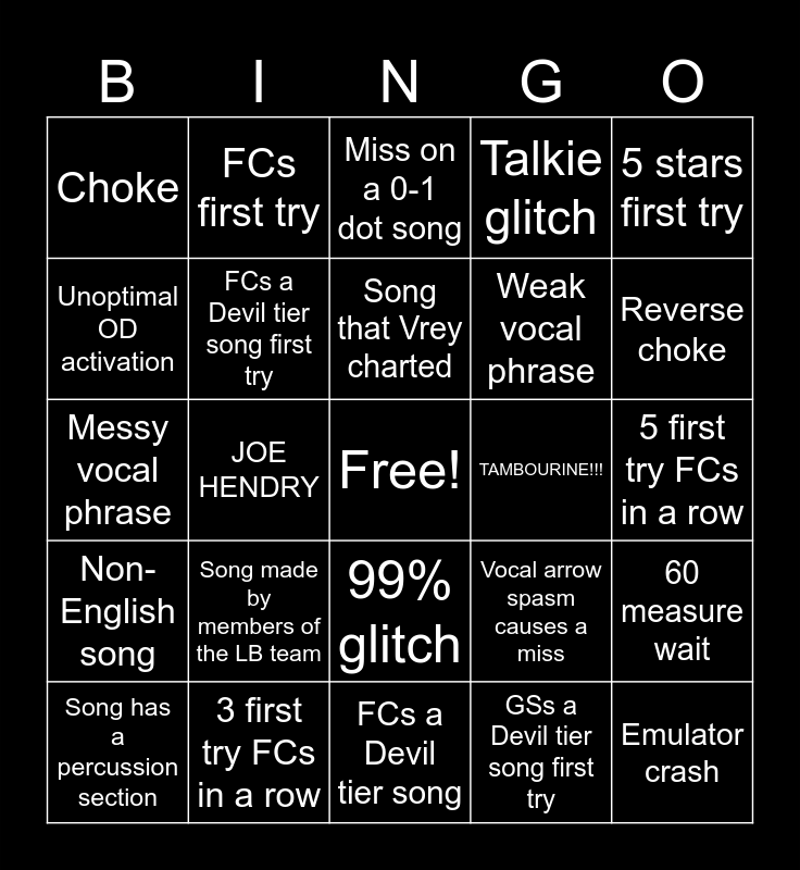 This bingo card has a free space and 33 words: Choke on the last phrase, GSs first try, JOE HENDRY, 100% on percussion section, Non-English song, FCs a Devil tier song first try, 5 stars first try, Song has a percussion section, FCs first try, FCs a 5 dot song first try, Song that Vrey charted, Miss on a 0-1 dot song, Scandinavia, 10 first try FCs in a row, TAMBOURINE!!!, Reverse choke, 3 first try FCs in a row, Messy vocal phrase, Song made by members of the LB team, Vocal arrow spasm causes a miss, 99% glitch, Lag spike causes a miss, Choke, 5 first try FCs in a row, FCs a Devil tier song, Emulator crash, Talkie glitch, Weak vocal phrase, Unoptimal OD activation, 60 measure wait, 40 measure wait, GSs a Devil tier song first try and 20 measure wait.