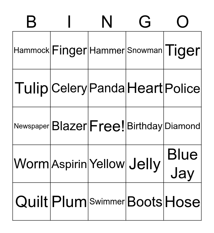 This bingo card has a free space and 24 words: Aspirin, Plum, Panda, Quilt, Tiger, Hammock, Tulip, Finger, Birthday, Yellow, Heart, Newspaper, Jelly, Blue Jay, Celery, Boots, Diamond, Hammer, Police, Blazer, Hose, Worm, Snowman and Swimmer.