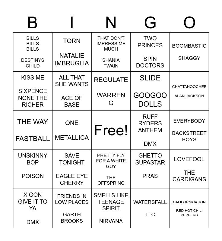This bingo card has a free space and 50 words: WONDERWALL OASIS, CALIFORNICATION RED HOT CHILI PEPPERS, WASN'T ME SHAGGY, SMELLS LIKE TEENAGE SPIRIT NIRVANA, SAVE TONIGHT EAGLE EYE CHERRY, NO DIGGITY BLACKSTREET, TORN NATALIE IMBRUGLIA, WHATS UP? 4 NON BLONDES, KISS ME SIXPENCE NONE THE RICHER, GETTIN' JIGGY WITH IT WILL SMITH, ALL THAT SHE WANTS ACE OF BASE, TWO PRINCES SPIN DOCTORS, LOVEFOOL THE CARDIGANS, GHETTO SUPASTAR PRAS, BREAKFAST AT TIFFANYS DEEP BLUE, MIAMI WILL SMITH, REGULATE WARREN G, RUFF RYDERS ANTHEM DMX, OPP NAIGHTY BY NATURE, BOOMBASTIC SHAGGY, ONE METALLICA, WATERSFALL TLC, BILLS BILLS BILLS DESTINYS CHILD, SLIDE GOOGOO DOLLS, SANTERIA SUBLIME, HOLD MY HAND HOOTIE & THE BLOWFISH, CHATTAHOOCHEE ALAN JACKSON, I'M IN A HURRY ALABAMA, THAT DON'T IMPRESS ME MUCH SHANIA TWAIN, PRETTY FLY FOR A WHITE GUY THE OFFSPRING, THIS IS HOW WE DO MONTELL JORDAN, MAMBO 5 LOU BEGA, PARTY UP DMX, ONE WEEK BARENAKED LADIES, FRIENDS IN LOW PLACES GARTH BROOKS, MY HEART WILL GO ON CELINE DION, CLOSING TIME SUBLIME, MY NAME IS EMINEM, SAY MY NAME DESTINYS CHILD, EVERYBODY BACKSTREET BOYS, NO SCRUBS TLC, I SWEAR ALL-4-ONE, HEY LEONARDO BLESSED UNION, BACK AT ONE BRIAN MCKNIGHT, X GON GIVE IT TO YA DMX, THE WAY FASTBALL, NAME GOO GOO DOLLS, THEY DON'T REALLY CARE ABOUT US MICHAEL JACKSON, UNSKINNY BOP POISON and EVERYBODY DANCE NOW C+C FACTORY.