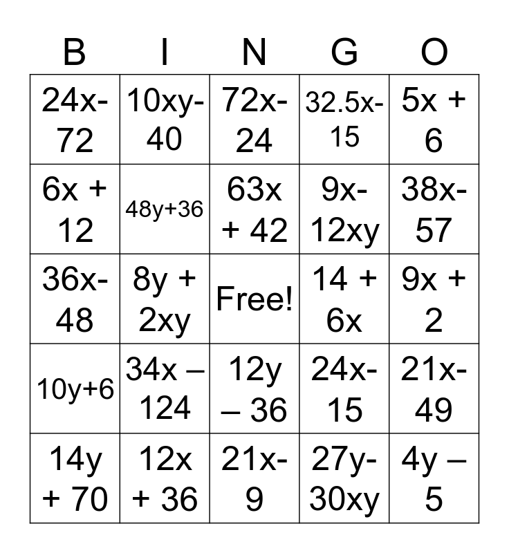 This bingo card has a free space and 30 words: 12x + 36, 4x + xy, 8y + 2xy, 20-10x, 24x-72, 72x-24, 48y+36, 12y – 36, 14 + 6x, 21x-9, 9x + 2, 4y – 5, 27y-30xy, 7x+3, 38x-57, 10y-22.5, 24x-15, 10y+6, 34x – 124, 5x + 6, 36x-48, 27y + 18, 10xy-40, 9x-12xy, 6x + 12, 32.5x-15, 21x-49, 14y + 70, 63x + 42 and 28y-35.