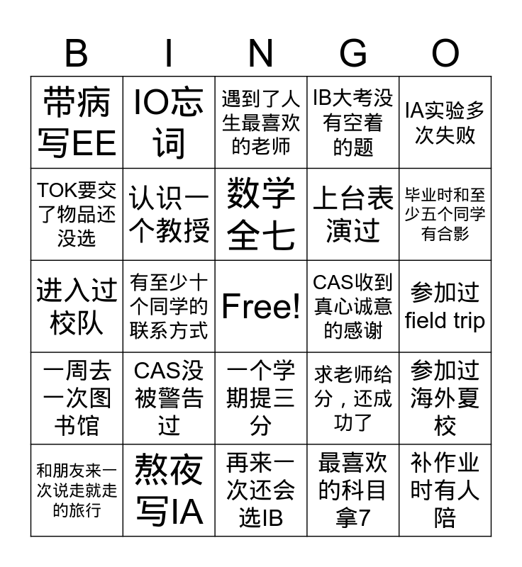 This bingo card has a free space and 24 words: CAS没被警告过, 熬夜写IA, 数学全七, 和朋友来一次说走就走的旅行, IA实验多次失败, 带病写EE, TOK要交了物品还没选, IO忘词, CAS收到真心诚意的感谢, 一个学期提三分, 上台表演过, 进入过校队, 求老师给分,还成功了, 参加过海外夏校, 认识一个教授, 最喜欢的科目拿7, 参加过field trip, 遇到了人生最喜欢的老师, 毕业时和至少五个同学有合影, 有至少十个同学的联系方式, 补作业时有人陪, 一周去一次图书馆, IB大考没有空着的题 and 再来一次还会选IB.