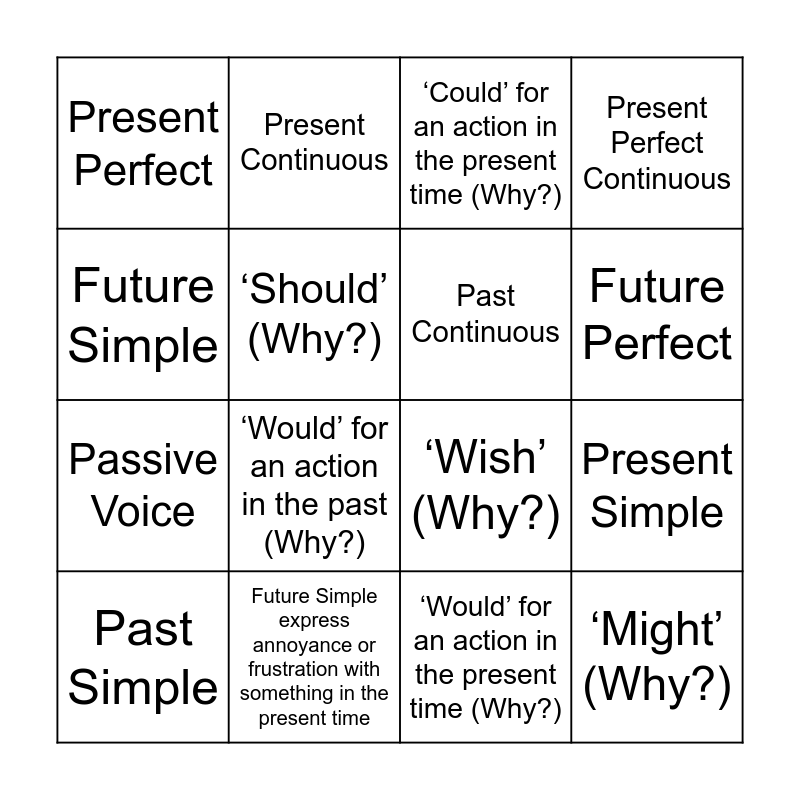 This bingo card has 16 words: Future Simple express annoyance or frustration with something in the present time, Present Simple, ‘Could’ for an action in the present time (Why?), Present Perfect, Passive Voice, Present Continuous, ‘Wish’ (Why?), ‘Would’ for an action in the present time (Why?), Future Simple, ‘Should’ (Why?), Past Simple, Present Perfect Continuous, ‘Would’ for an action in the past (Why?), Future Perfect, Past Continuous and ‘Might’ (Why?).