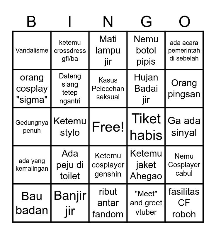 This bingo card has a free space and 24 words: Ada peju di toilet, Banjir jir, Kasus Pelecehan seksual, Bau badan, ada acara pemerintah di sebelah, Vandalisme, orang cosplay "sigma", ketemu crossdress gfl/ba, Tiket habis, Ketemu cosplayer genshin, Hujan Badai jir, Gedungnya penuh, Ketemu jaket Ahegao, Nemu Cosplayer cabul, Dateng siang tetep ngantri, "Meet" and greet vtuber, Ga ada sinyal, Mati lampu jir, Orang pingsan, Ketemu stylo, fasilitas CF roboh, ada yang kemalingan, Nemu botol pipis and ribut antar fandom.