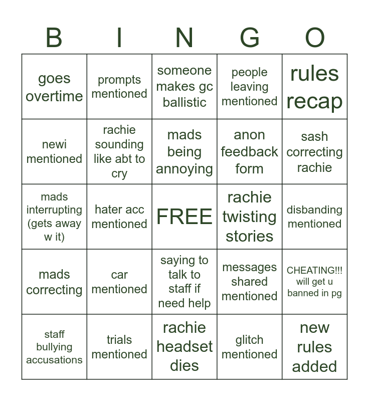 This bingo card has a free space and 24 words: car mentioned, trials mentioned, mads being annoying, staff bullying accusations, rules recap, goes overtime, newi mentioned, prompts mentioned, rachie twisting stories, saying to talk to staff if need help, anon feedback form, mads interrupting (gets away w it), messages shared mentioned, CHEATING!!! will get u banned in pg, rachie sounding like abt to cry, glitch mentioned, disbanding mentioned, someone makes gc ballistic, sash correcting rachie, hater acc mentioned, new rules added, mads correcting, people leaving mentioned and rachie headset dies.