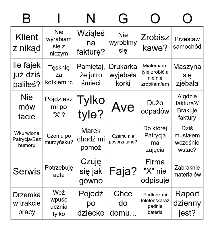 This bingo card has 36 words: Faja?, Czuję się jak gówno, Chce do domu..., Ile fajek już dziś paliłeś?, Wkurwiona Patrycja/Bez humoru, Ave, Tęsknię za kotkiem :c, Pojedź po dziecko, Zrobisz kawe?, Firma "X" nie odpisuje, Maszyna się zjebała, Nie wyrobimy się, Zabraknie materiałów, Pójdziesz mi po "X"?, Drukarka wyjebała korki, Klient z nikąd, Serwis, Dużo odpadów, Nie mów tacie, Wziąłeś na fakturę?, Tylko tyle?, Czemu po murzyńsku?, Czemu nie posprzątane?, Marek chodź mi pomóż, Do której Patrycja ma zajęcia, Nie wyrabiam się z niczym, Miałem/am tyle zrobić a nic nie zrobiłem/am, Weź wpuść ucznia tylko, Pamiętaj, że jutro śmieci, Przestaw samochód, Raport dzienny jest?, Drzemka w trakcie pracy, Dziś musiałem wcześnie wstać?, A gdzie faktura?/ Brakuje faktury, Potrzebuję auta and Podłącz mi telefon/Zaraz padnie bateria.
