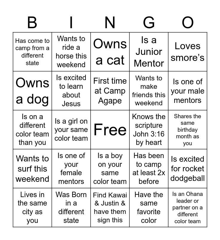 This bingo card has a free space and 24 words: Is one of your female mentors, Was Born in a different state, First time at Camp Agape, Lives in the same city as you, Loves smore’s, Has come to camp from a different state, Owns a dog, Wants to ride a horse this weekend, Knows the scripture John 3:16 by heart, Is a boy on your same color team, Wants to make friends this weekend, Is on a different color team than you, Has been to camp at least 2x before, Is excited for rocket dodgeball, Is excited to learn about Jesus, Have the same favorite color, Shares the same birthday month as you, Owns a cat, Is one of your male mentors, Is a girl on your same color team, Is an Ohana leader or partner on a different color team, Wants to surf this weekend, Is a Junior Mentor and Find Kawai & Justin & have them sign this.