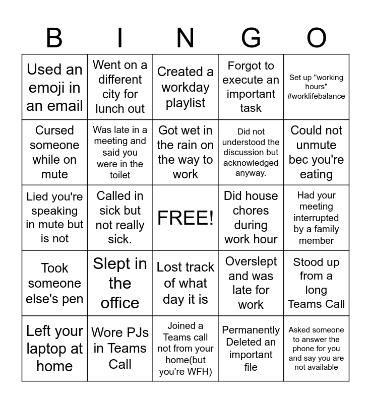 This bingo card has a free space and 24 words: Left your laptop at home, Slept in the office, Got wet in the rain on the way to work, Permanently Deleted an important file, Set up "working hours" #worklifebalance, Used an emoji in an email, Went on a different city for lunch out, Created a workday playlist, Did house chores during work hour, Had your meeting interrupted by a family member, Lied you're speaking in mute but is not, Was late in a meeting and said you were in the toilet, Overslept and was late for work, Stood up from a long Teams Call, Cursed someone while on mute, Wore PJs in Teams Call, Joined a Teams call not from your home(but you're WFH), Forgot to execute an important task, Could not unmute bec you're eating, Took someone else's pen, Called in sick but not really sick., Lost track of what day it is, Did not understood the discussion but acknowledged anyway. and Asked someone to answer the phone for you and say you are not available.