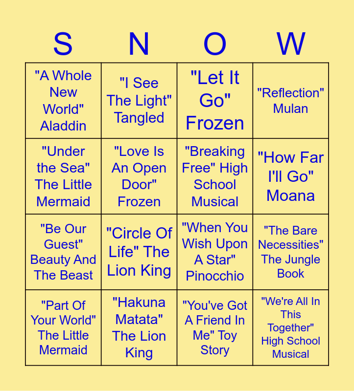 This bingo card has 16 words: "Hakuna Matata" The Lion King, "The Bare Necessities" The Jungle Book, "Let It Go" Frozen, "A Whole New World" Aladdin, "Be Our Guest" Beauty And The Beast, "I See The Light" Tangled, "When You Wish Upon A Star" Pinocchio, "You've Got A Friend In Me" Toy Story, "Under the Sea" The Little Mermaid, "Love Is An Open Door" Frozen, "Part Of Your World" The Little Mermaid, "Reflection" Mulan, "Circle Of Life" The Lion King, "How Far I'll Go" Moana, "Breaking Free" High School Musical and "We're All In This Together" High School Musical.