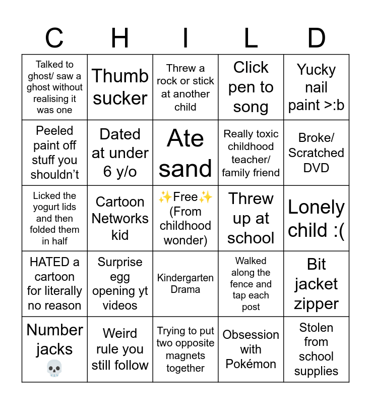 This bingo card has a free space and 24 words: Number jacks 💀, Surprise egg opening yt videos, Ate sand, Obsession with Pokémon, Yucky nail paint >:b, Talked to ghost/ saw a ghost without realising it was one, Thumb sucker, Threw a rock or stick at another child, Threw up at school, Lonely child :(, Licked the yogurt lids and then folded them in half, Dated at under 6 y/o, Walked along the fence and tap each post, Bit jacket zipper, Peeled paint off stuff you shouldn’t, Weird rule you still follow, Trying to put two opposite magnets together, Click pen to song, Broke/ Scratched DVD, HATED a cartoon for literally no reason, Cartoon Networks kid, Kindergarten Drama, Really toxic childhood teacher/ family friend and Stolen from school supplies.