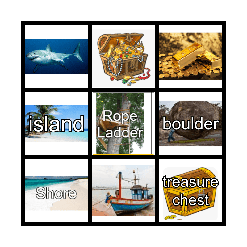 This bingo card has 9 images and 3 words: island, boulder and treasure chest.