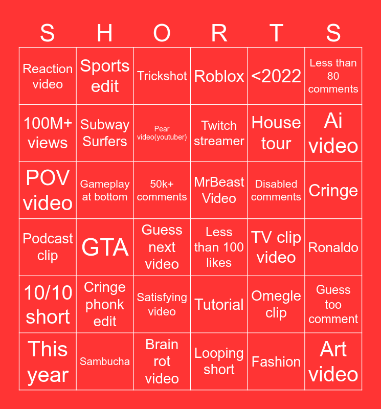 Short bingo | Hardcore youtube shorts | youtube shorts bingo | Youtube shorts bingo | youtube shorts bingo