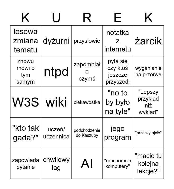 This bingo card has 25 words: uczeń/ uczennica, AI, zapomniał o czymś, zapowiada pytanie, żarcik, losowa zmiana tematu, znowu mówi o tym samym, dyżurni, "no to by było na tyle", podchodzenie do Kaszuby, pyta się czy ktoś jeszcze przyszedł, W3S, jego program, "przeczytajcie", ntpd, "macie tu kolejną lekcje?", "Lepszy przykład niż wyklad", przysłowie, wyganianie na przerwę, wiki, ciekawostka, chwilowy lag, "kto tak gada?", notatka z internetu and "uruchomcie komputery".