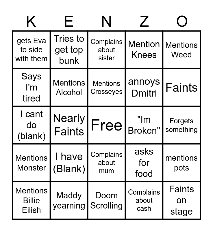 This bingo card has a free space and 24 words: Mentions Billie Eilish, I have (Blank), Mentions Crosseyes, Complains about cash, Mentions Weed, gets Eva to side with them, Tries to get top bunk, Complains about sister, "Im Broken", Forgets something, I cant do (blank), Mentions Alcohol, asks for food, mentions pots, Says I'm tired, Maddy yearning, Doom Scrolling, Mention Knees, Faints, Mentions Monster, Nearly Faints, Complains about mum, annoys Dmitri and Faints on stage.