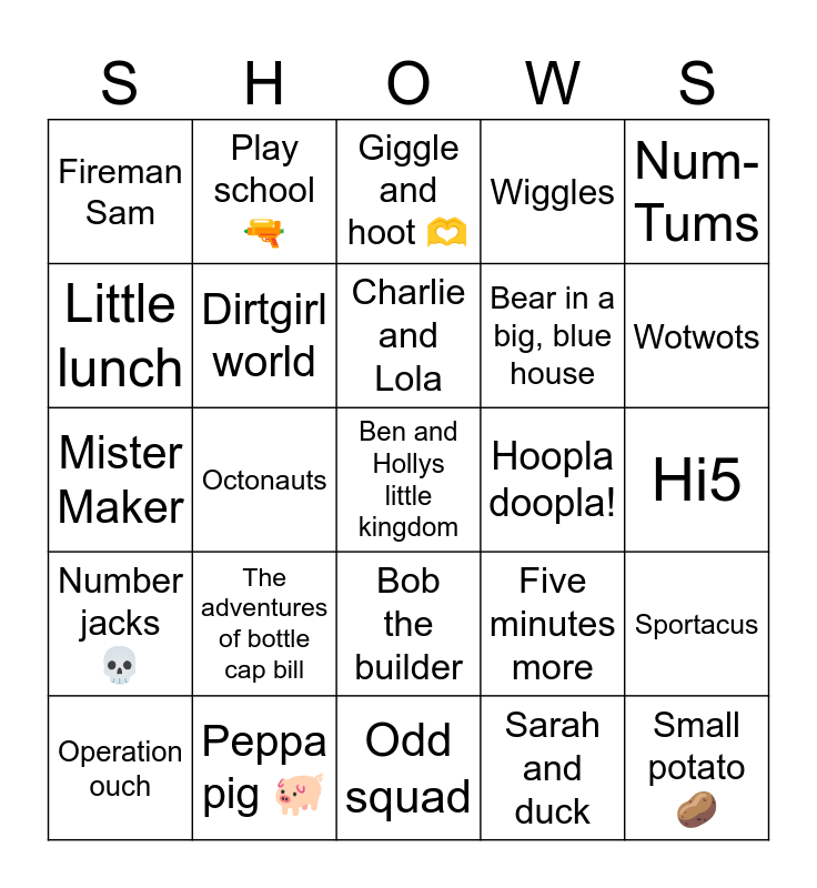 This bingo card has 25 words: Number jacks 💀, Peppa pig 🐖, Ben and Hollys little kingdom, Sarah and duck, Num-Tums, Fireman Sam, Play school 🔫, Giggle and hoot 🫶, Hoopla doopla!, Sportacus, Little lunch, Dirtgirl world, Odd squad, Five minutes more, Wotwots, Operation ouch, Octonauts, Charlie and Lola, Bear in a big, blue house, Hi5, Mister Maker, The adventures of bottle cap bill, Bob the builder, Wiggles and Small potato 🥔.