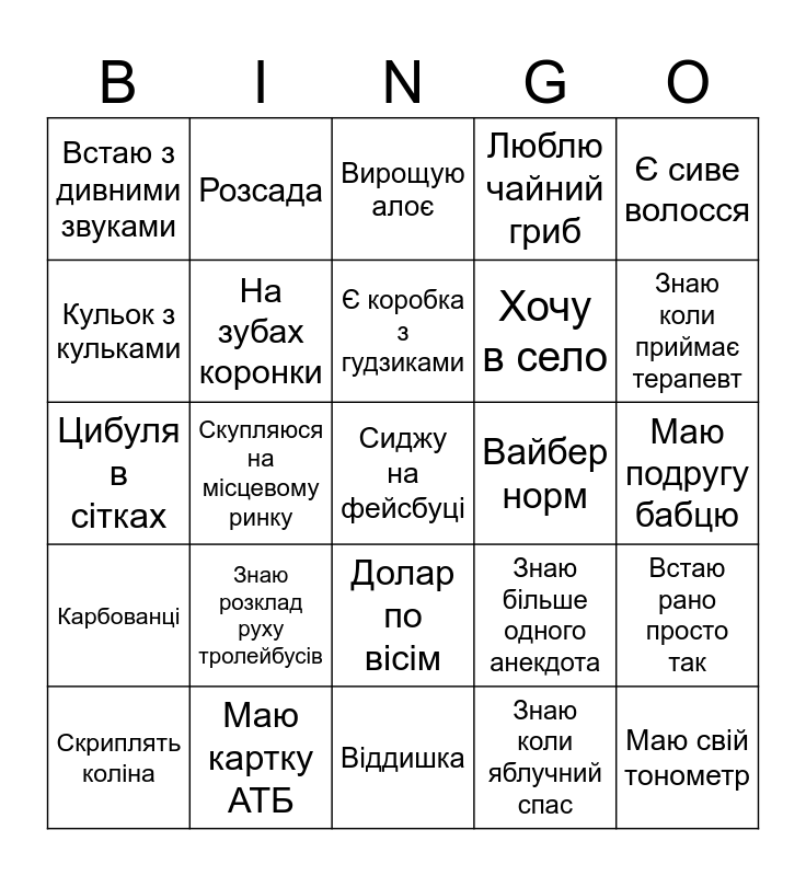 This bingo card has a free space and 24 words: Знаю розклад руху тролейбусів, Маю картку АТБ, Є коробка з гудзиками, Скриплять коліна, Є сиве волосся, Встаю з дивними звуками, Кульок з кульками, Розсада, Вайбер норм, Долар по вісім, Хочу в село, Цибуля в сітках, Знаю більше одного анекдота, Встаю рано просто так, На зубах коронки, Знаю коли яблучний спас, Маю подругу бабцю, Вирощую алоє, Знаю коли приймає терапевт, Скупляюся на місцевому ринку, Маю свій тонометр, Карбованці, Люблю чайний гриб and Віддишка.