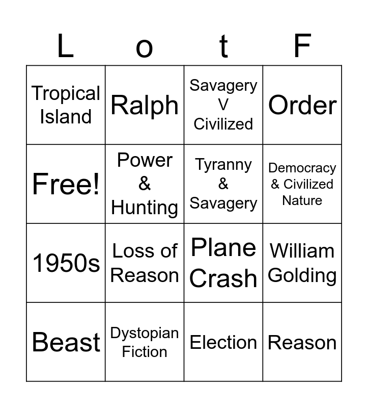 This bingo card has 16 words: Dystopian Fiction, William Golding, Savagery V Civilized, Tropical Island, 1950s, Ralph, Plane Crash, Election, Free!, Power & Hunting, Beast, Order, Loss of Reason, Democracy & Civilized Nature, Tyranny & Savagery and Reason.