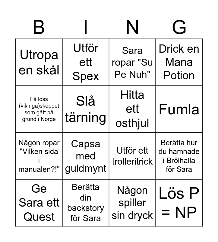 This bingo card has 16 words: Berätta din backstory för Sara, Berätta hur du hamnade i Brölhalla för Sara, Sara ropar "Su Pe Nuh", Utropa en skål, Någon ropar "Vilken sida i manualen?!", Utför ett Spex, Utför ett trolleritrick, Någon spiller sin dryck, Få loss (vikinga)skeppet som gått på grund i Norge, Slå tärning, Ge Sara ett Quest, Drick en Mana Potion, Capsa med guldmynt, Fumla, Hitta ett osthjul and Lös P = NP.