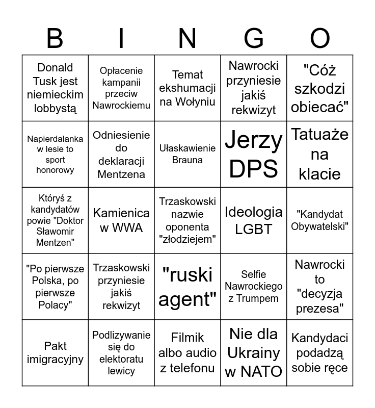 This bingo card has 25 words: Trzaskowski przyniesie jakiś rekwizyt, Filmik albo audio z telefonu, Ułaskawienie Brauna, Pakt imigracyjny, "Cóż szkodzi obiecać", Donald Tusk jest niemieckim lobbystą, Napierdalanka w lesie to sport honorowy, Opłacenie kampanii przeciw Nawrockiemu, Ideologia LGBT, "ruski agent", Jerzy DPS, Któryś z kandydatów powie "Doktor Sławomir Mentzen", Selfie Nawrockiego z Trumpem, Nawrocki to "decyzja prezesa", Odniesienie do deklaracji Mentzena, Kandydaci podadzą sobie ręce, "Kandydat Obywatelski", Temat ekshumacji na Wołyniu, Tatuaże na klacie, Kamienica w WWA, Trzaskowski nazwie oponenta "złodziejem", Podlizywanie się do elektoratu lewicy, "Po pierwsze Polska, po pierwsze Polacy", Nawrocki przyniesie jakiś rekwizyt and Nie dla Ukrainy w NATO.