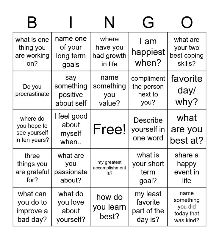 This bingo card has a free space and 24 words: what are you passionate about?, what do you love about yourself?, name something you value?, what can you do to improve a bad day?, what are your two best coping skills?, what is one thing you are working on?, Do you procrastinate, name one of your long term goals, Describe yourself in one word, my greatest accomplishment is?, compliment the person next to you?, where do you hope to see yourself in ten years?, what is your short term goal?, share a happy event in life, say something positive about self, my least favorite part of the day is?, what are you best at?, where have you had growth in life, favorite day/ why?, I feel good about myself when.., name something you did today that was kind?, three things you are grateful for?, I am happiest when? and how do you learn best?.